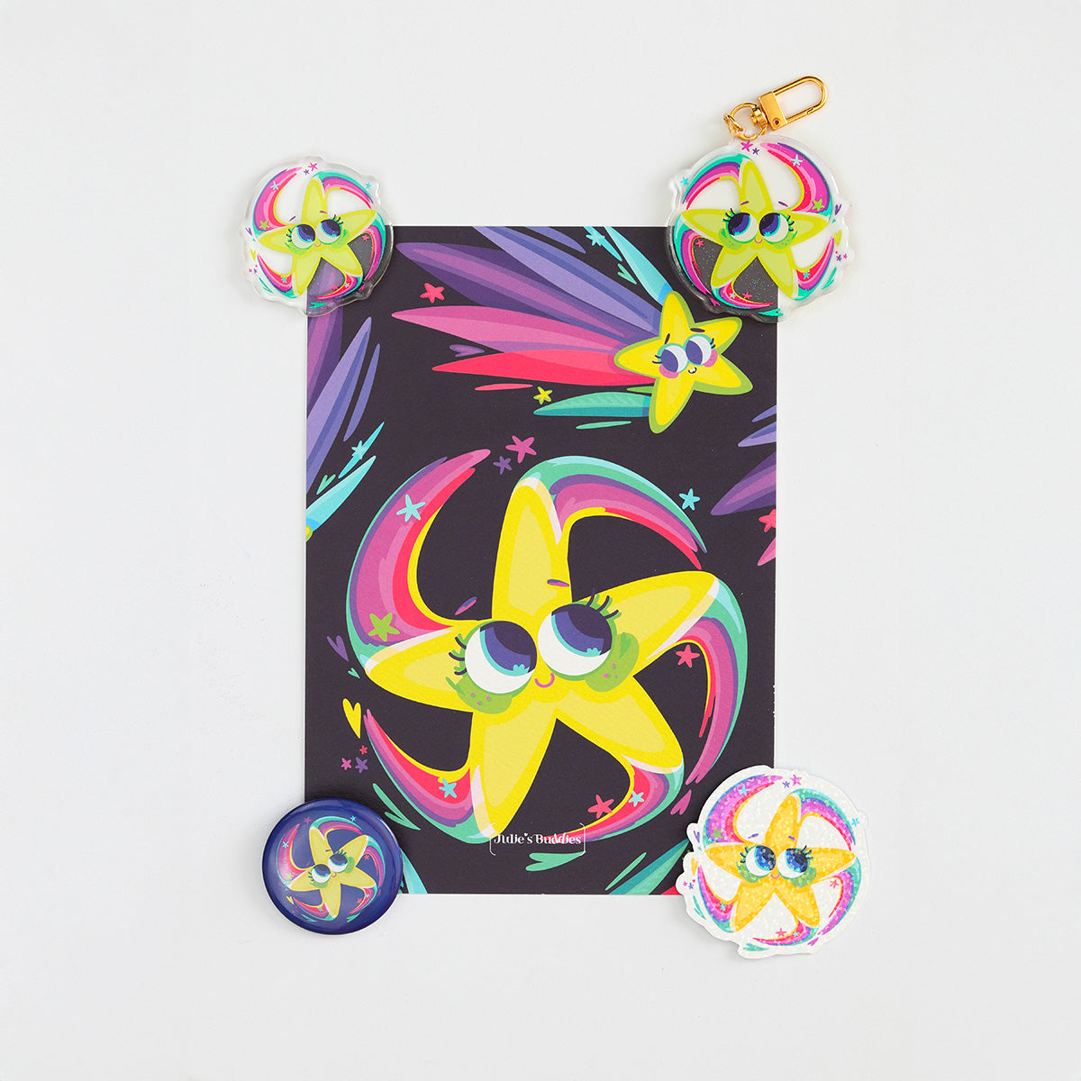 Share a vibrant message of affection and wonder with our Shooting Star Rainbow Postcard! This unique, whimsical art card captures the ultimate feeling of joy and happiness! It features a stunningly bright cartoon shooting star mascot with big, expressive eyes and a sweet, sparkling smile, set against a deep, cosmic background. The star is dynamically framed by intricate, vibrant trails of rainbow energy (bright blues, electric pinks, neon yellows), echoing the lively, explosive color palette of our character art.