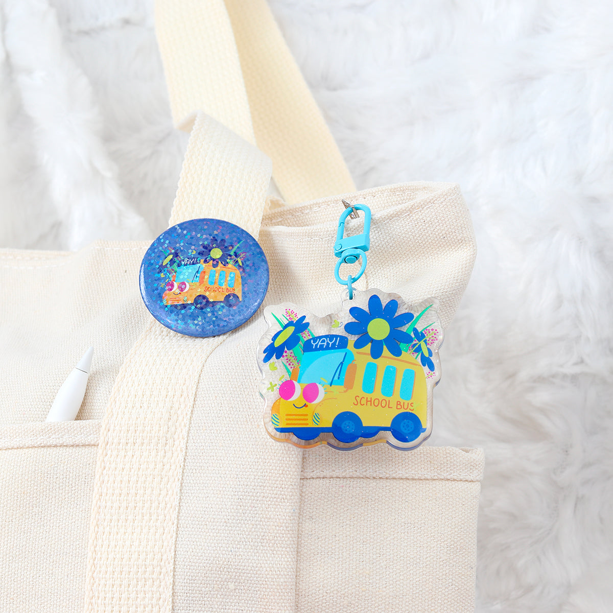 Let joy ride along with this adorable school bus keychain! Made from high-quality acrylic and covered in dazzling glitter epoxy on both sides. Features a sturdy blue-colored metal hook. Perfect for keys, bags, or as a sweet and cheerful gift for students, teachers, or anyone who loves a bit of whimsy. Measures approximately 5 cm in height. Make every day an adventure!