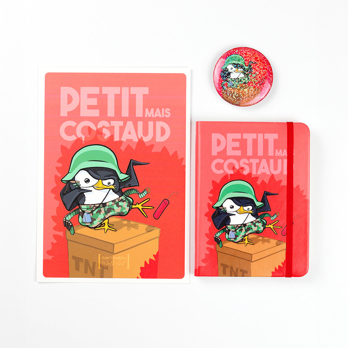 L'illustration met en scène un adorable pingouin déterminé, casqué et en tenue de camouflage, tenant de la dynamite, avec le message inspirant : « Petit mais costaud ».