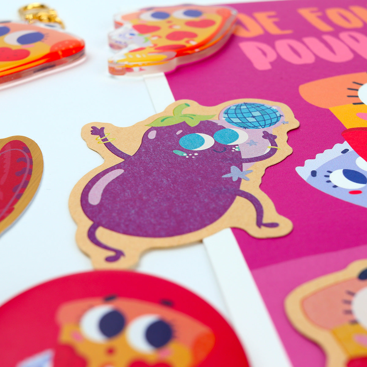 - Porte-clés Pizza Cœur : Un porte-clés double face en acrylique résistant et coloré, en forme de part de pizza. Accrochez-le à vos clés ou à votre sac pour emporter votre gourmandise préférée partout avec vous !