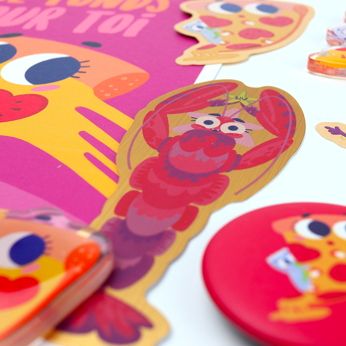 - Badge Pizza : Un badge rond rouge vif représentant une part de pizza, accompagné d’un petit sachet de sauce piquante. Idéal pour personnaliser vos vestes, sacs ou accessoires.