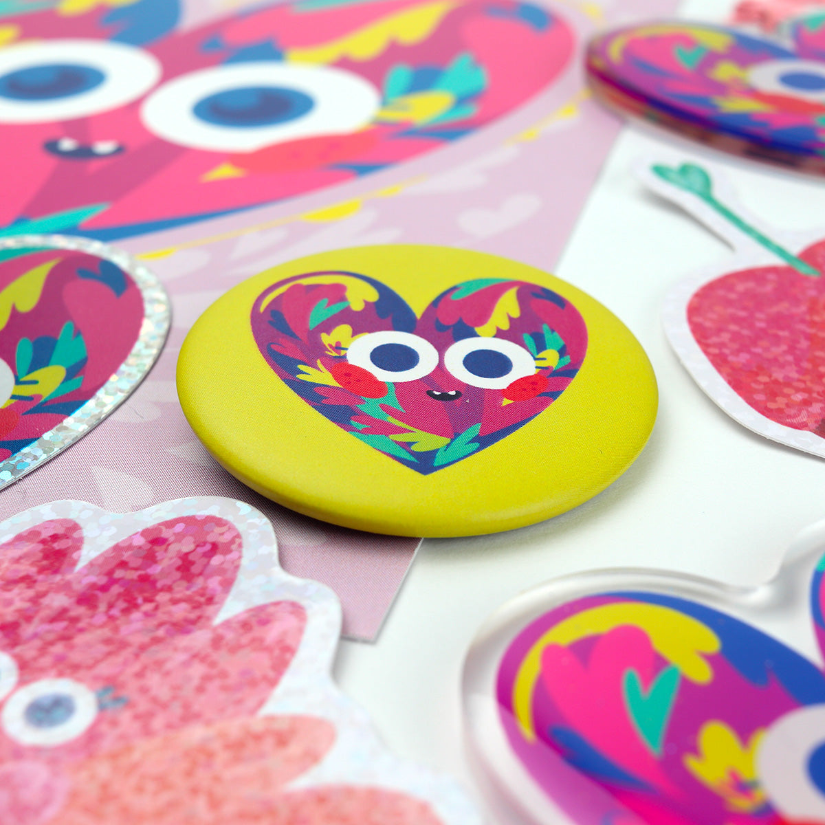 - Badge Cœur Amoureux : Un badge rond jaune vif affichant le visage du cœur. Sa finition mate le rend parfait pour décorer vos vestes ou accessoires.