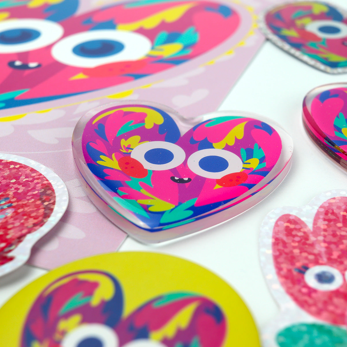 - Porte-Clés Cœur Coloré : Un porte-clés en acrylique double face, résistant et éclatant de couleurs, reprenant le motif principal du cœur. Accrochez-le à vos clés, sac ou trousse pour une touche de bonne humeur quotidienne.